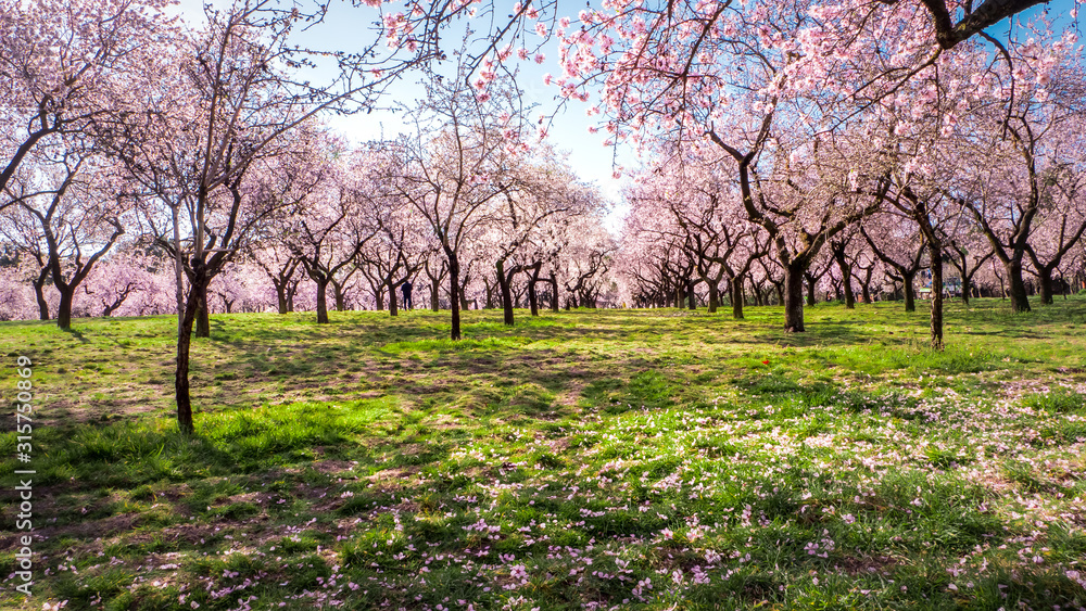 Pink alleys of blooming with flowers almond trees in a park in Madrid, Spain spring