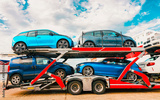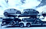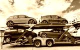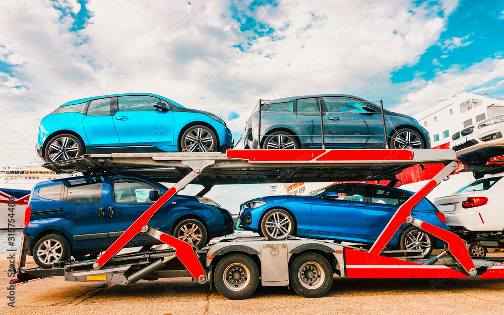 Car transporter on road at port of Cagliari in Sardinia Island, Italy summer. Truck trailer driving on motorway at highway. Mixed media.