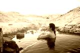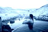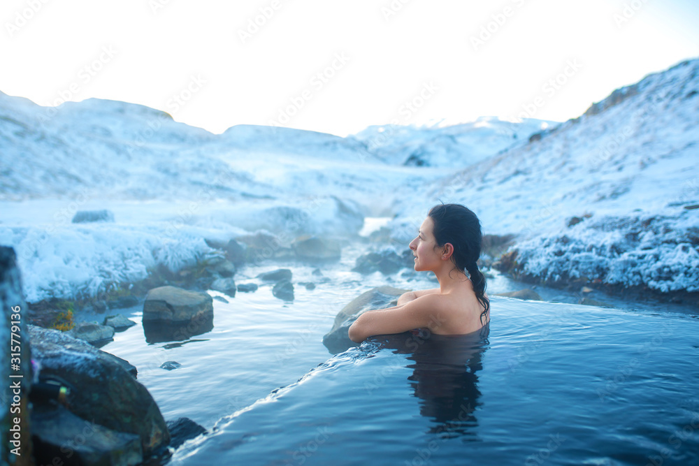 The girl bathes in a hot spring in the open air with a gorgeous view of the snowy mountains. Incredible iceland in winter.