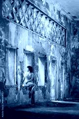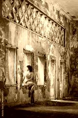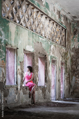 girl in a pink dress sits on the windowsill of an old abandoned building