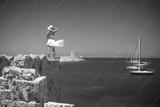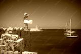 girl in a white skirt stands on the edge of a stone wall and looks at the sailboats