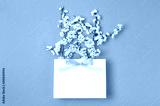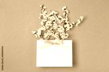 White gift bag with gold ribbon and branch of spring white flowers on bright pink background. Greeting card with delicate flowers Pink floral background. Spring minimal concept. Flat lay top view