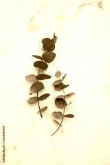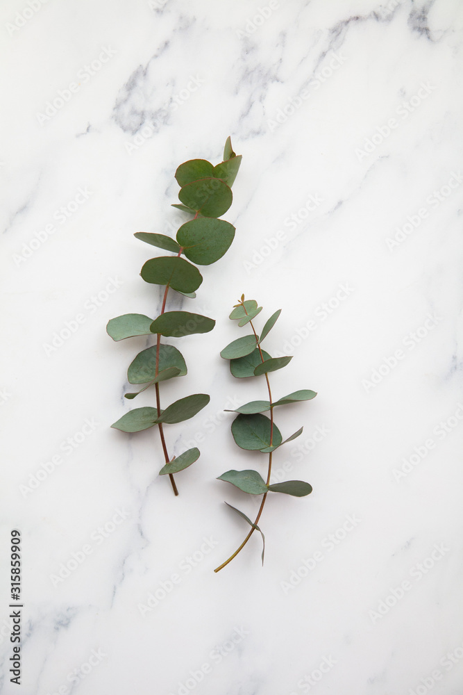 Branches of eucalyptus leaves on a marble background. Lay flat