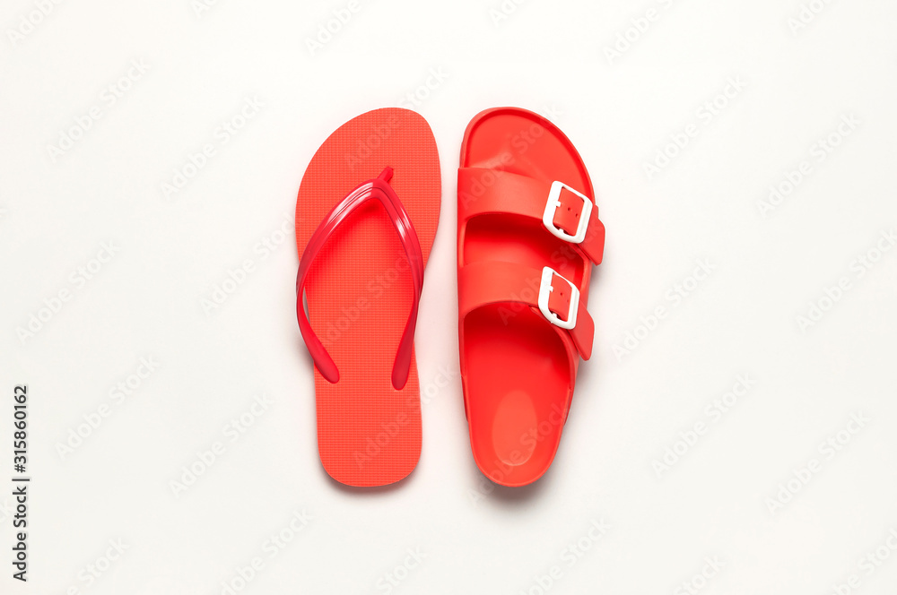 Fashionable beach coral flip flops and sandals on white background. Flat lay, top view, copy space. Creative beach concept, stylish summer shoes, vacation, travel. Trend coral color
