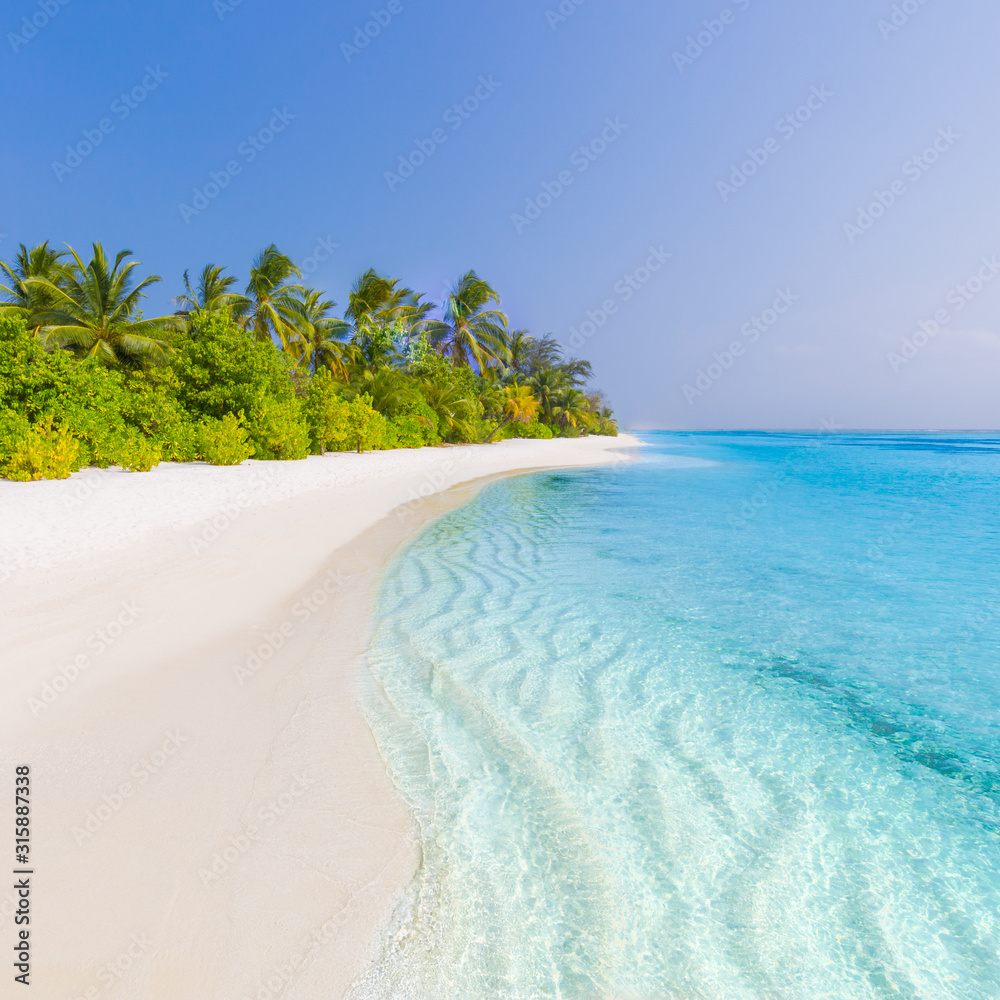 Tropical beach scene, blue sea and palm trees and white sand, summer vacation and holiday background concept