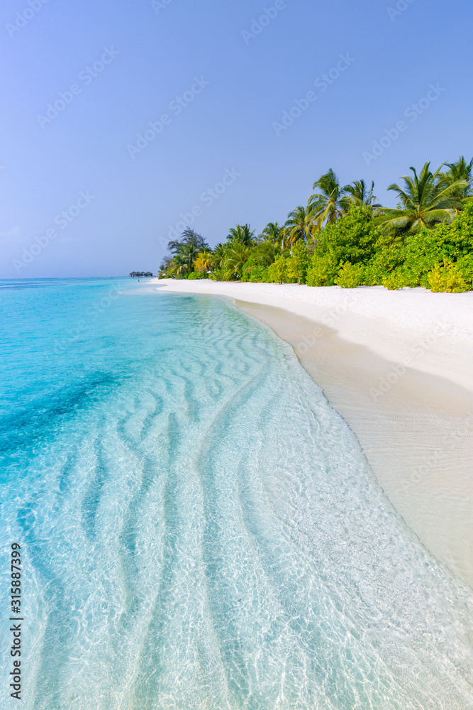 Tropical beach scene, blue sea and palm trees and white sand, summer vacation and holiday background concept