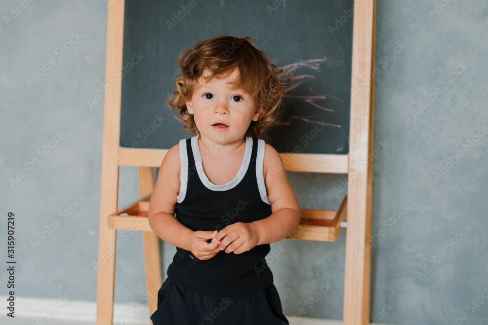 small child draws with chalk on a black chalk Board at home in the nursery against a gray wall.