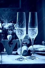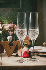 st. Valentines day or wedding romantic table setting with wooden letters love, needle felted hearts, ceramic plates, bouquet of pink roses, couple glasses of champagne on natural linen tablecloth.