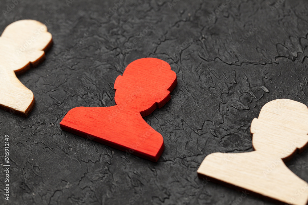 Staff recruitment. The figures of the workers are all the same and one in red. Leader Choice. HR. Black background