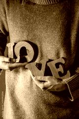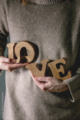 Wooden letters word LOVE in female hands. St Valentines day greeting card