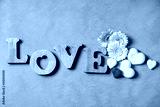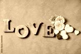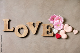 Word LOVE from oak wooden letters with variety of pink roses flowers and felted hearts over brown texture background. Flat lay, space. St. Valentines greeting card