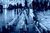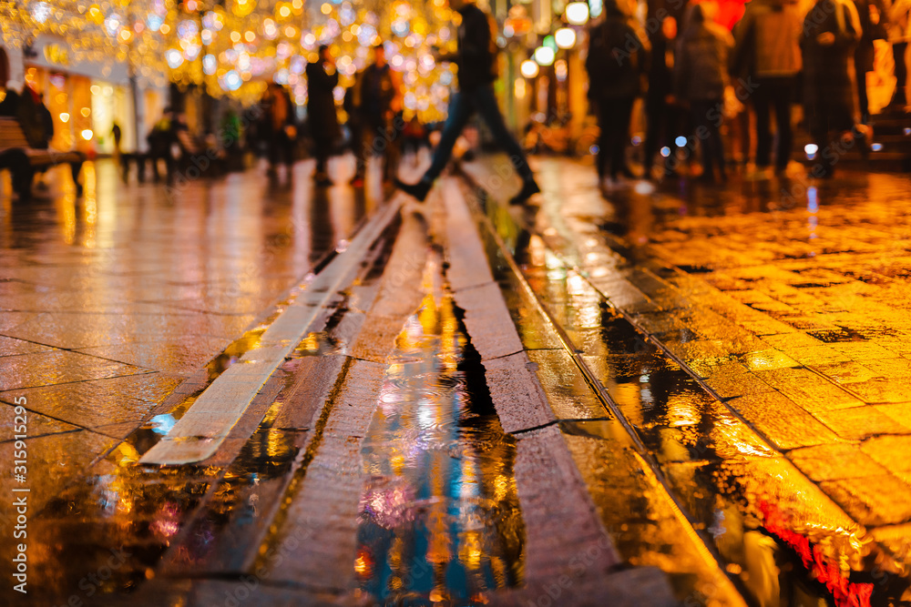 Rainy night in a big city, reflections of lights on the wet road surface.