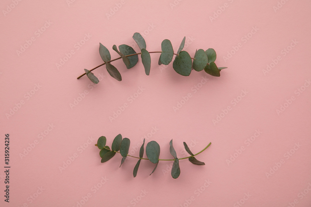 Border of eucalyptus leaves on a pastel pink background. Lay flat
