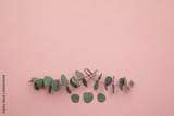 Border of eucalyptus leaves on a pastel pink background. Lay flat