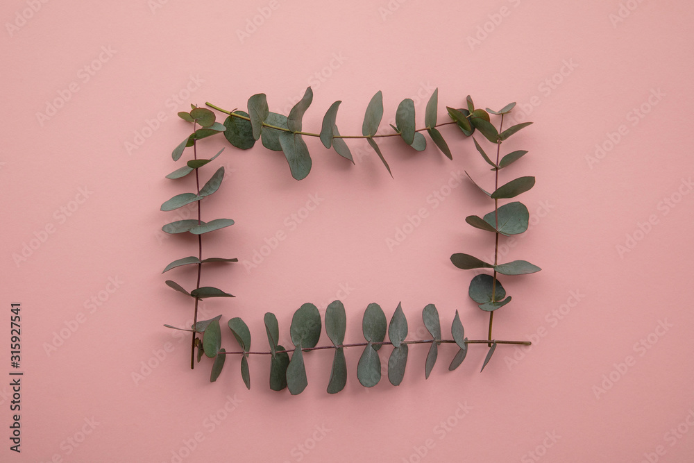 Border of eucalyptus leaves on a pastel pink background. Lay flat