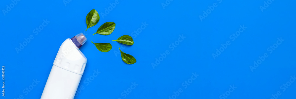 White plastic bottle for liquid detergent, cleaning agent, bleach, antibacterial gel with natural plant extract and green leaves on blue background. Eco style cleaning concept. Flat lay top view
