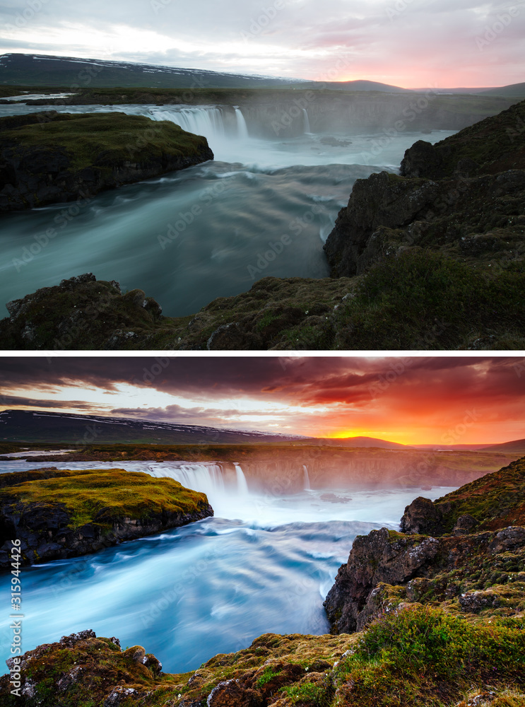 Amazing view of powerful Godafoss cascade, Iceland, Europe. Images before and after.