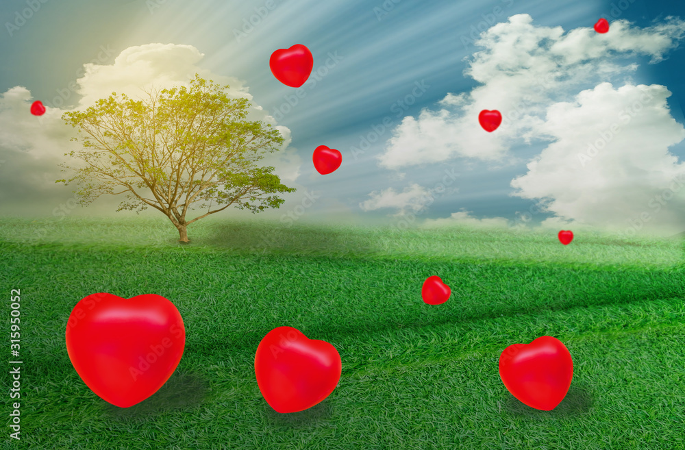 Red heart ball on Green grass. natural background texture.Valentine day.