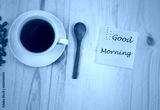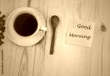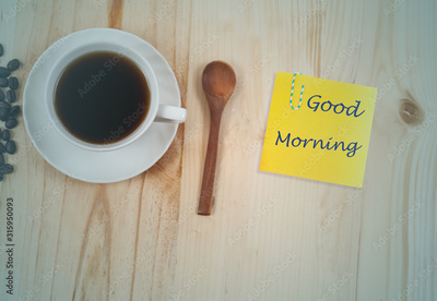 Good morning text with white Cup of coffee on Pine wood desktop table on top view.