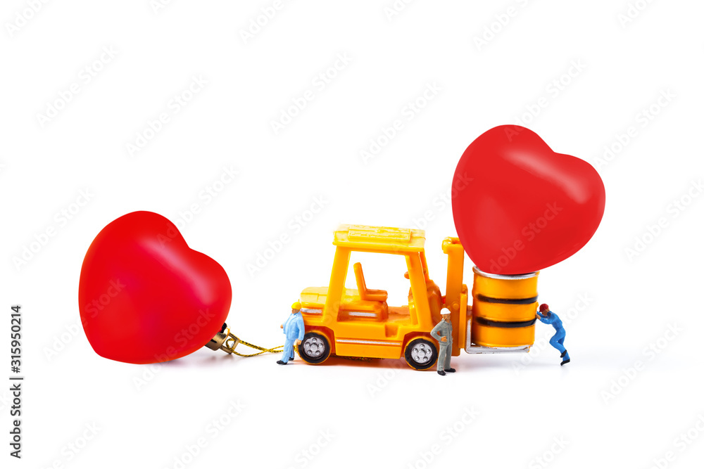 Miniature worker and small forklift with heart ball,Valentine day.