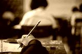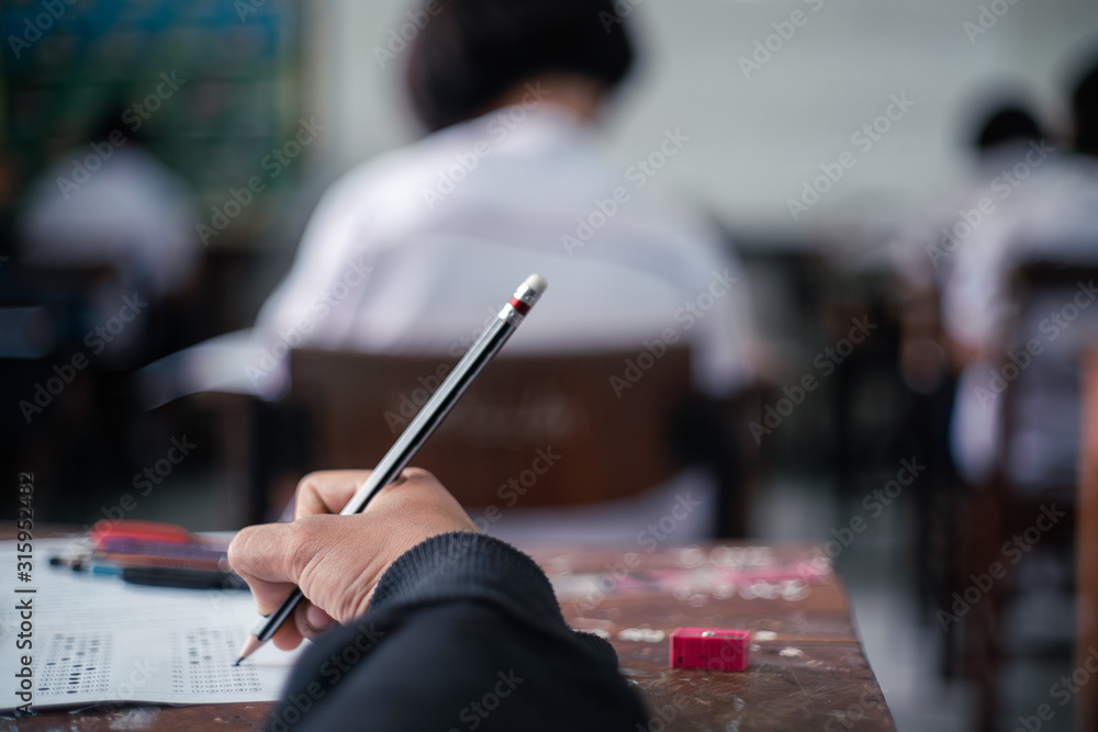 Students taking exam with stress in school classroom.