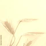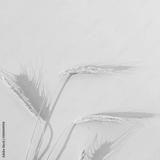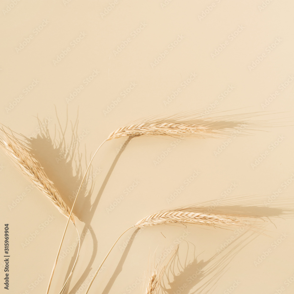 Ears of rye, wheat on pastel beige background. Flat lay, top view minimal organic healthy raw food concept.