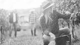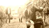 Frau als Erntehelfer bei Traubenlese im Weinberg