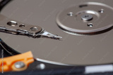 Extreme closeup of mechanic components of a hard drive - magnetic disc called platter and reading head
