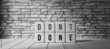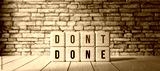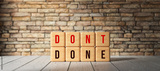 cubes with the words DON'T and DONE in front of a brick wall on wooden floor