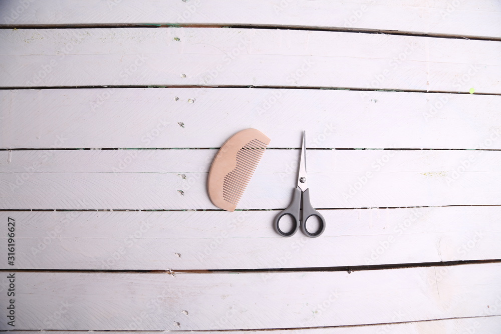 wooden comb and scissors in color background