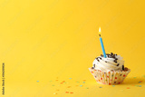 Cupcake with candle on yellow background, space for text