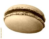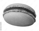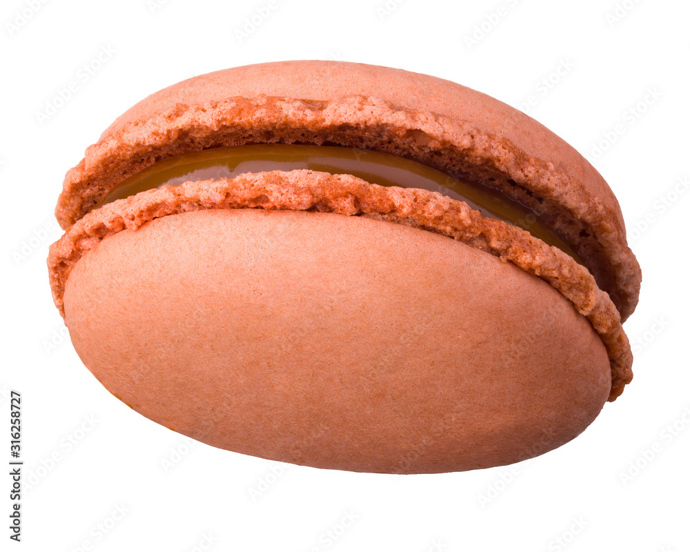 Macro photo of french caramel macaroon or macaron isolated on white background