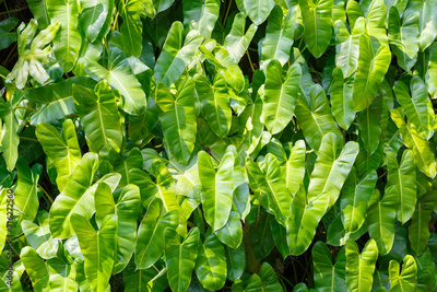 Pattern of tropical, palm leaves illuminated by the bright sun . Rainforest or jungle background.