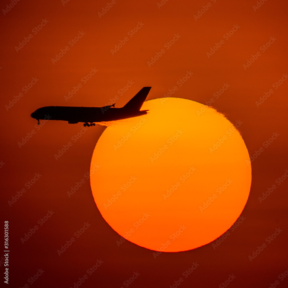 Silhouette of passenger airplane with the morning sunrise background