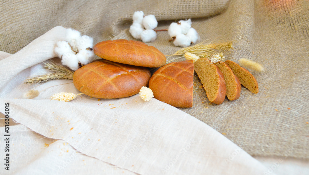 Sliced rye cake on a tablecloth