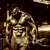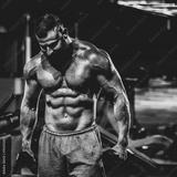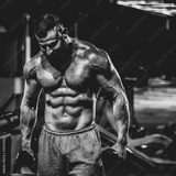 Portrait of strong handsome fit man exercising in gym with dumbbells, dramatic black and white image