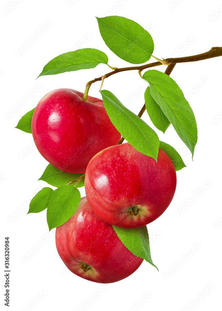 Apple isolated. Three red ripe juicy apples on branch with green leaves isolated on white background as design for package