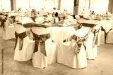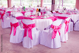Wedding chairs in row decorated with pink color ribbon at outdoor .