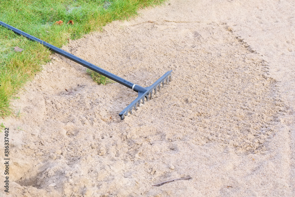 Rake in sand bunker at golf links course green for golfers