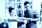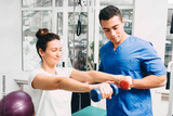 woman correctly performs exercise in the gym for the treatment of arthritis of the hands. The physiotherapist oversees the patient’s exercise. Two dumbbells in the hands of a woman for exercise