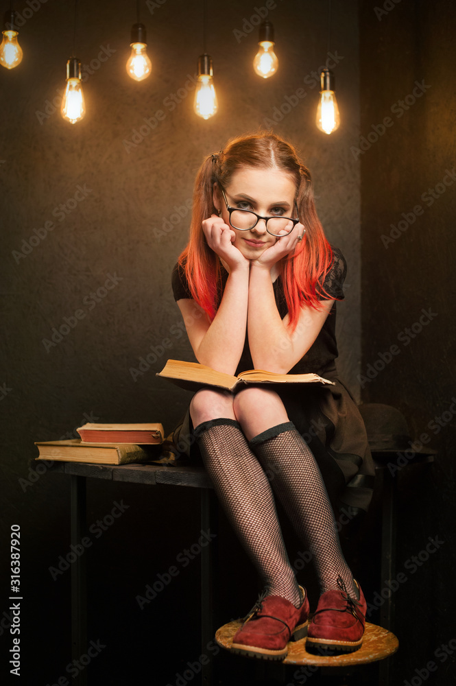 Young creative student with glasses and red pigtails with book with illuminated Edison lamps in the background