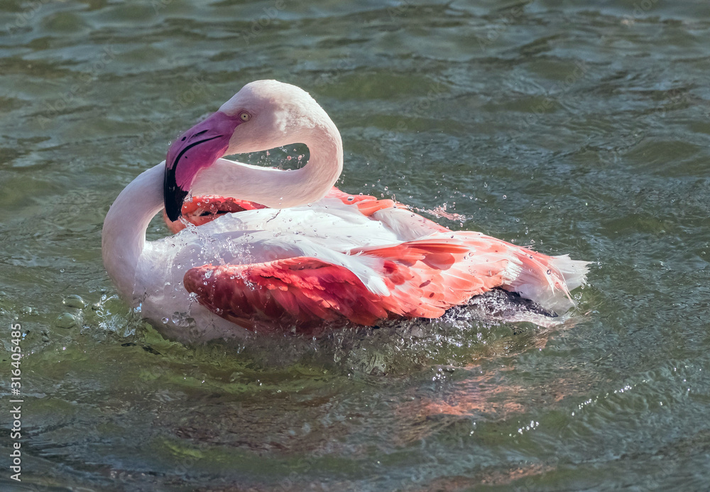 Caribbean Pink Flamingo Splashing in a Lake