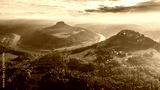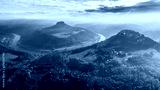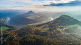 Konigstein Fortress - a Saxon mountain fortress near the town of Konigstein, located on a plateau rising 247 meters above the Elbe level, bathed in fog, aerial view