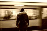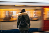 Lonely young woman with backpack shot from behind at subway station with blurry moving train in background