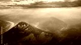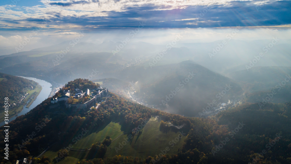 Konigstein Fortress - a Saxon mountain fortress near the town of Konigstein, located on a plateau rising 247 meters above the Elbe level, bathed in fog, aerial view