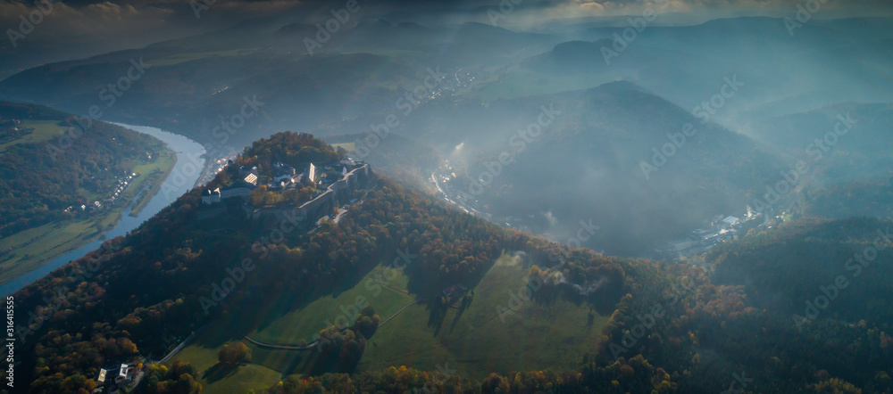 Konigstein Fortress - a Saxon mountain fortress near the town of Konigstein, located on a plateau rising 247 meters above the Elbe level, bathed in fog, aerial view