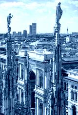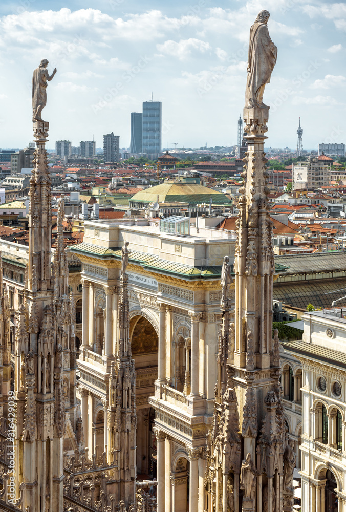 Milan Cathedral spires overlooking the Galleria Vittorio Emanuele II, Milan, Italy. Scenery of luxury Gothic roof with statues.