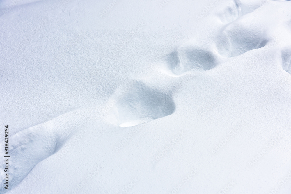 Snow texture abstract background. Smooth footprints on fresh snow cover. Scene of white nature surface in winter.