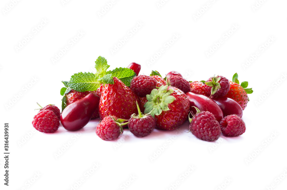 Ripe red berries isolated on white background.Juicy and delicious raspberries, strawberries and dogwoods. Background of mix fruits with copy space for text. Red berries and fruits.