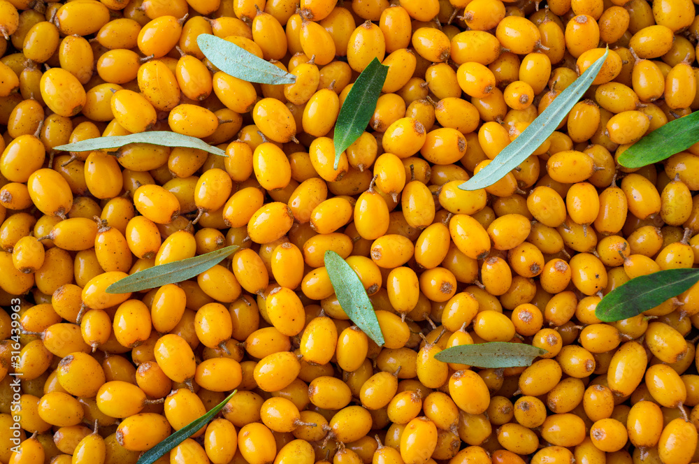 Sea-buckthorn background. Ripe and fragrant sea-buckthorn. Fresh yellow berry with leaves. Fresh berry background. Texture buckthorn berries close up. Top view.